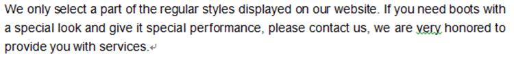 হ্যাঁ, আমরা পণ্যের গুণমানকে এন্টারপ্রাইজ বিকাশের প্রথম প্রাণশক্তি হিসাবে বিবেচনা করি। আমাদের বুট উচ্চ মানের. আমরা শুধুমাত্র আন্তর্জাতিক পরিবেশগত মান পূরণ করে এমন কাঁচামাল ব্যবহার করি।